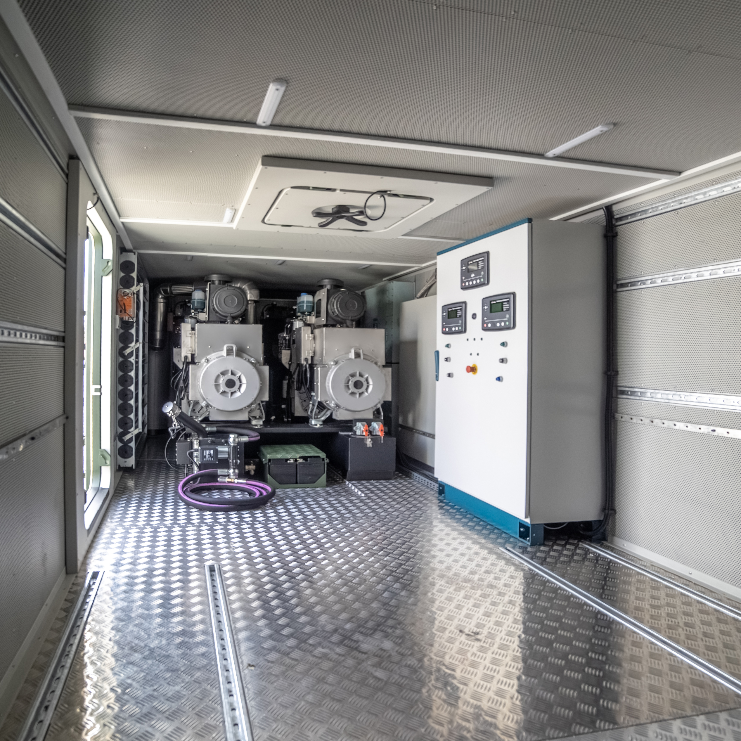 Zespoły prądotwórcze umieszczono w części technicznej kontenera, natomiast przestrzeń magazynowa przeznaczona jest na przechowywanie dodatkowego wyposażenia.