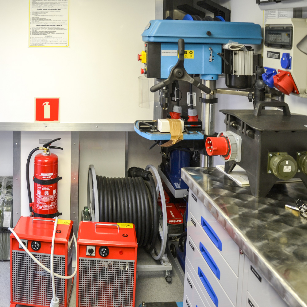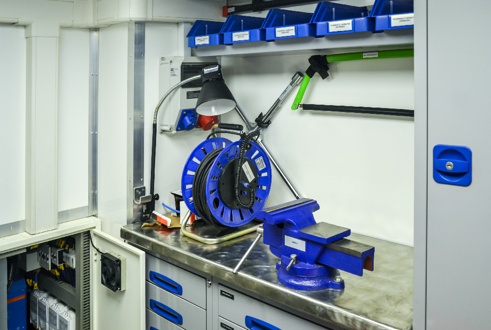 W przedziałach użytkowych kontenerów zlokalizowano stanowiska pracy dla czterech techników. Przestrzeń warsztatowa została wyposażona w: