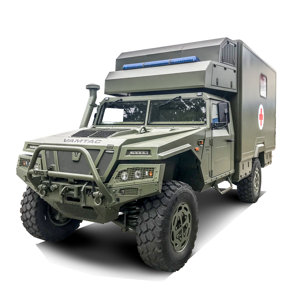 Bazę pojazdu stanowi URO VAMTAC z nadwoziem wykonanym z wytrzymałej stali nierdzewnej. Kabina kierowcy jest konstrukcyjnie oddzielona od przedziału medycznego, a zabudowa może zostać zdemontowana. Układ klimatyzacji i ogrzewania działa również przy wyłączonym silniku, zgodnie z Regulaminem ONZ nr 122. Stały napęd 4×4, blokady mechanizmów różnicowych oraz wysoka mobilność terenowa umożliwiają skuteczne działanie w wymagających warunkach.